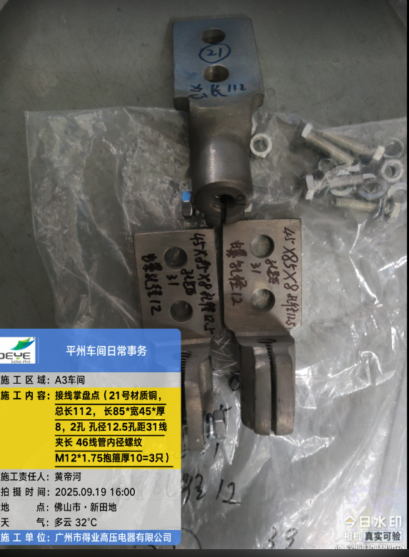 铜 接线掌 总长112 掌长85 掌宽45 掌厚8 孔数2 孔径φ12.5 邻边孔距31 对角孔距无 线夹长度46 线管内径及螺纹M12*1.75 抱箍厚度10 有图纸 内部编号21