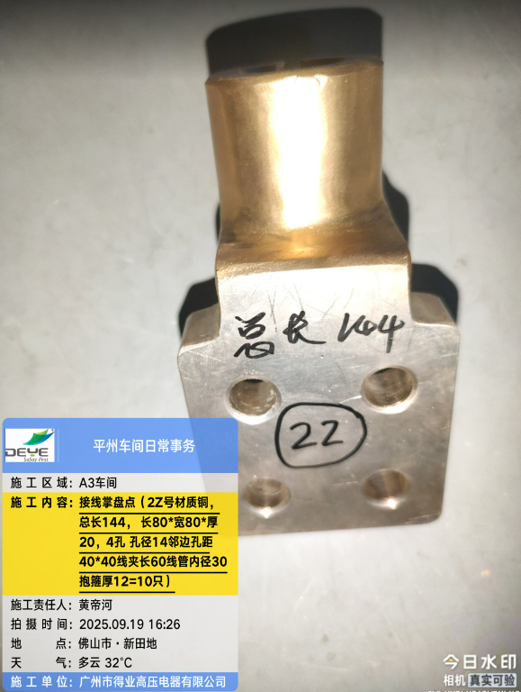 铜 接线掌 总长144 掌长80 掌宽80 掌厚20 孔数4 孔径φ14 邻边孔距40*40 对角孔距57 线夹长度60 线管内径φ30 抱箍厚度12 有图纸 内部编号22 20251211曾寄出一个样板未减未回