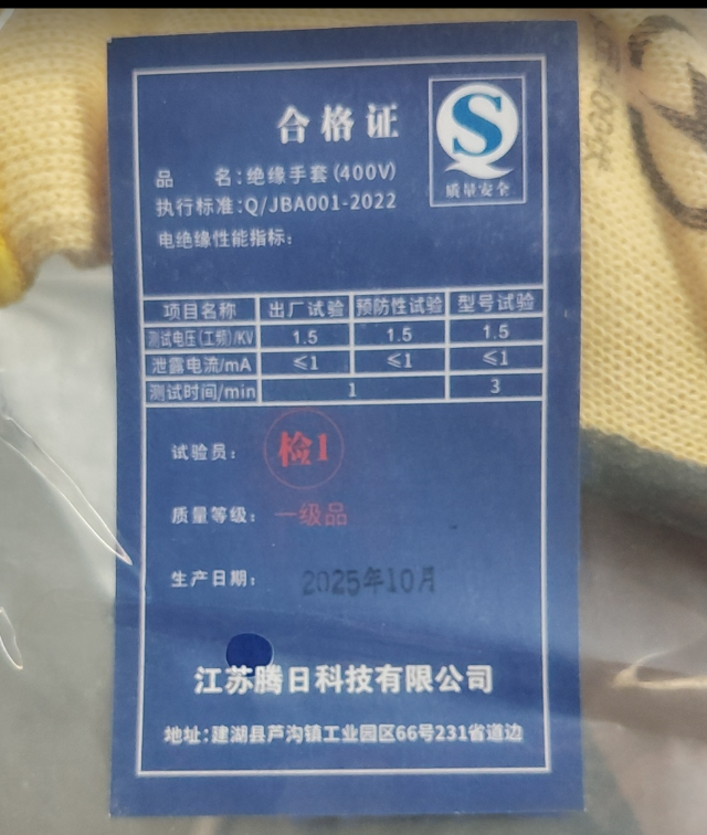 易耗件 滕日 短款绝缘手套400V